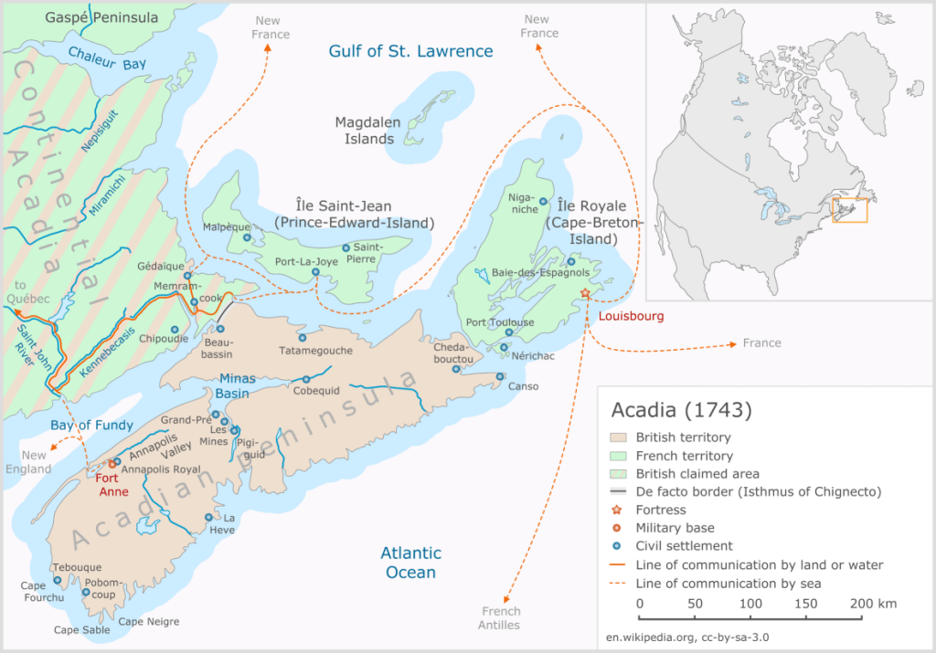 During the first half of the 18th century, the fault-line between the colonial empires of Great Britain and France ran through Canada’s Maritime region – the modern day provinces of Nova Scotia, New Brunswick and Prince Edward Island. During those years, these borderlands existed in an almost continuous state of unrest, frequently erupting in skirmishes, raids and clashes regardless of if it was a time of war or not. At the end of each officially declared war that touched the Maritimes, the French would lose another piece of their traditional colonial claims – first mainland Nova Scotia was ceded to the British in 1713, followed by the occupation of Île Royale and Île Saint-Jean in 1758, then finally New France in its entirety in 1763. Chaos ensued in the wake of those receding borders, and the Acadians were caught in the middle of it.