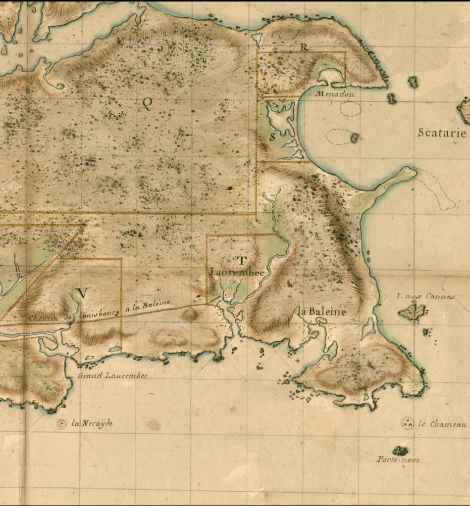 With fifty soldiers, twenty artillerymen and eight cannons, the detachment set off for Menadou, probably taking le chemin de Louisbourg à La Baleine, one of the Island’s main thoroughfares which connected the outports of Grand Lorembec (Today’s Big Lorraine), Petit Lorembec (Little Lorraine) and La Baleine to Louisbourg. Still in use today and known as the Louisbourg Main-A-Dieu Road, it’s one of the oldest roads in Canada. This road brings you through a part of the island that saw much early activity – in 1629 the Scots built the short lived Fort Rosemar in the Baleine area15, only for it to be burnt to the ground by French captain Charles Daniel, and in 1725 when the ship Le Chameau struck the Porte-nove rocks and broke up along the coast, the dead were interred at Baleine.