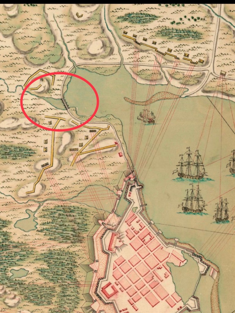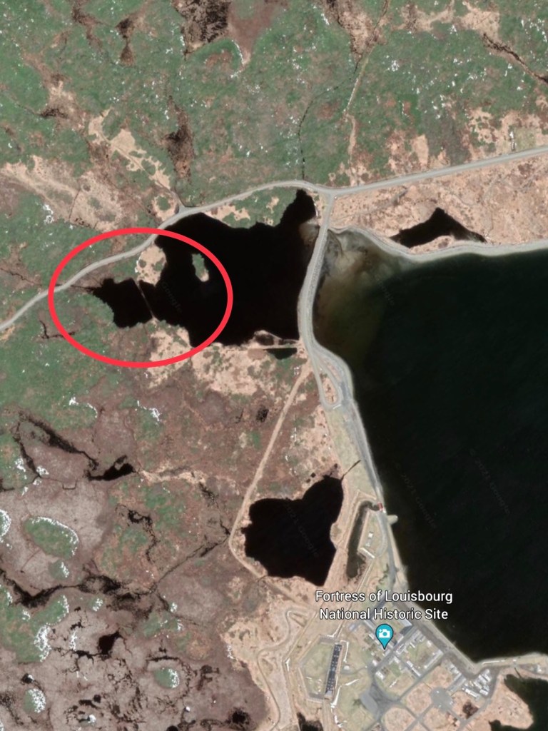 During the 18th century, the barachois at the bottom of Louisbourg harbour was the location of what was known as the fauxbourg, a neighbourhood of Louisbourg that existed outside of the fortress walls. The majority of inhabitants in this area were fisherman, and their properties were set up for the purpose of processing and drying cod. The road that ran from the Dauphin Gate, Louisbourg’s busiest entryway, hugged the shore of the harbour, wrapped around the barachois and then continued around the rest of Louisbourg harbour eastward (bottom left). At sometime during the first half of the 18th century, certain maps of Louisbourg began to include a bridge in their depiction of the fauxbourg while others did not. However, if we compare a modern satellite image of Louisbourg (bottom centre) with an 18th century map that depicts the 1758 Siege of Louisbourg, we find that the remains of that bridge or perhaps a causeway are still visible today (bottom right).