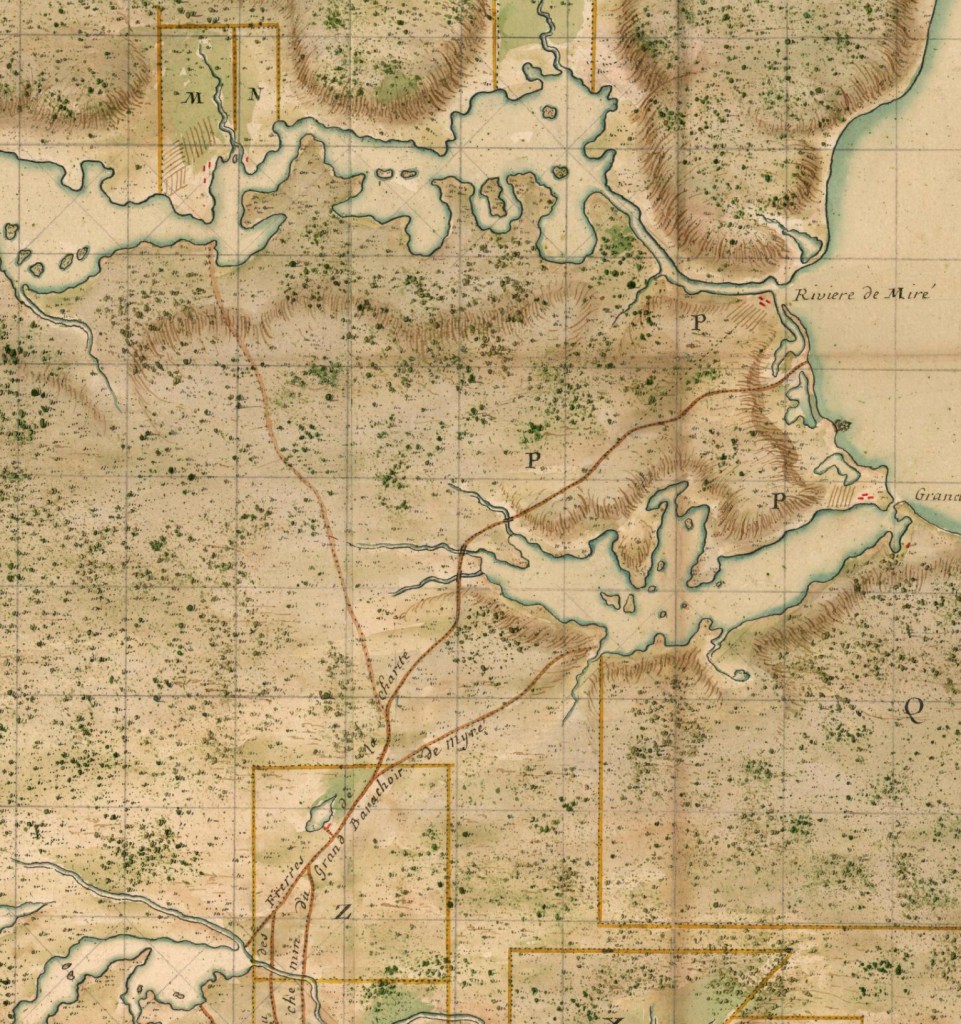 The Great Mira Road, or Le grand chemin de Miré, was one of the largest feats of engineering undertaken by the French outside of the Fortress of Louisbourg. It cut through twenty-or-so kilometres of thick coastal forest from Louisbourg harbour, weaving through present-day Cavanagh’s Lake, Kelly’s Lake, along the bottom shore of Twelve Mile Lake where it turned north, finally ending at what the French called The Ferriage1 on the shores of the Mira River opposite Two Rivers Wildlife Park. With over 25 bridges2 and at least ten feet wide, this road was a critical piece of infrastructure for 18th century Cape Breton. It allowed movement to and from the interior of the island for hunters, land owners, millers and also for couriers bringing official correspondence between Canada and Île Royale3. Many homesteads existed along the road during the time of Louisbourg, including properties owned by Pierre Boisseau, inn-keeper, Louisbourg judge Joseph Lartigue as well as the villages of Rouillé and Village des allemands closer toward the Mira. Marked as the Old French Road on today’s topographic maps, The Great Mira Road has, surprisingly enough, survived almost in its entirety. Its entrance is located at the very end of Park Service Rd., marked only with a small wildlife refuge sign. Once it comes out of the woods beyond Twelve Mile Lake, it connects to Oceanview Rd., then becomes the Gabarus Highway and continues along Campbelldale Rd. for a while where it would’ve veered northward toward French Village Lake. This last stretch of the road is the only part that doesn’t exist today, nor does it correspond to any contemporary road or community.