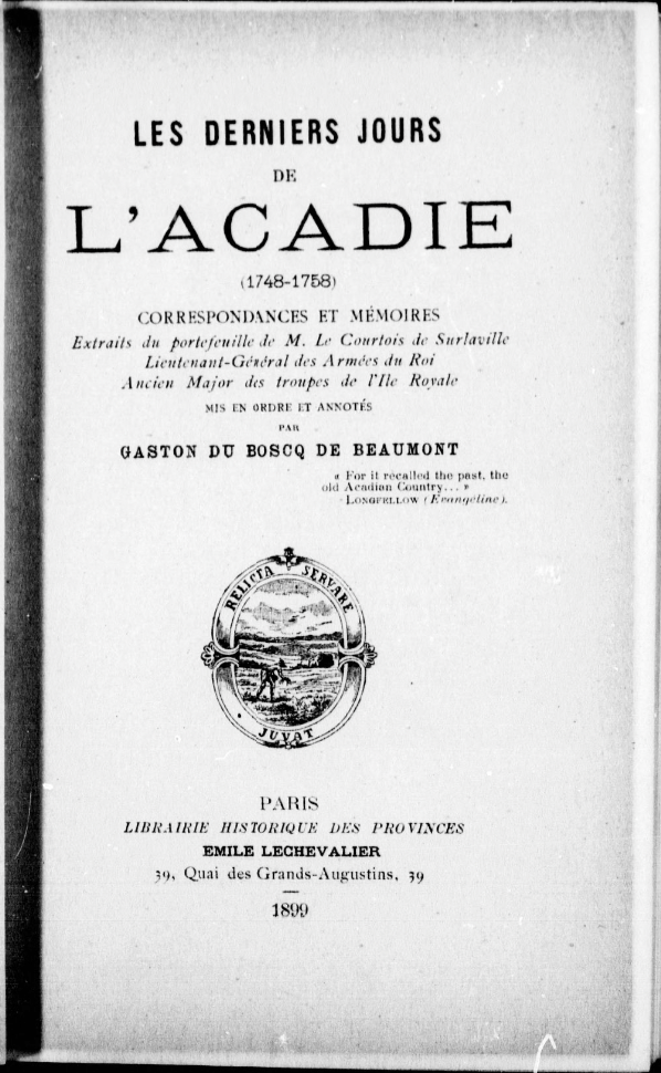Les Derniers Jours de l’Acadie, 1748 – 1758 by Gaston de Boscq de Beaumont – A compilation of correspondence that passed through the hands of Michel Balthazar Le Courtois de Surlaville during his brief stay in Cape Breton Island, Les Derniers Jours de l’Acadie is a critical piece of historical documentation that reveals what the final days of the French colony of Île Royale were like. It is also chock full of information pertaining to the events transpiring on mainland Nova Scotia during the same period. From these letters we get a fleeting glimpse into the Île Royale social scene, along with some of the latest colonial gossip sprinkled with Surlaville’s dry and sarcastic personal commentary. Read below: