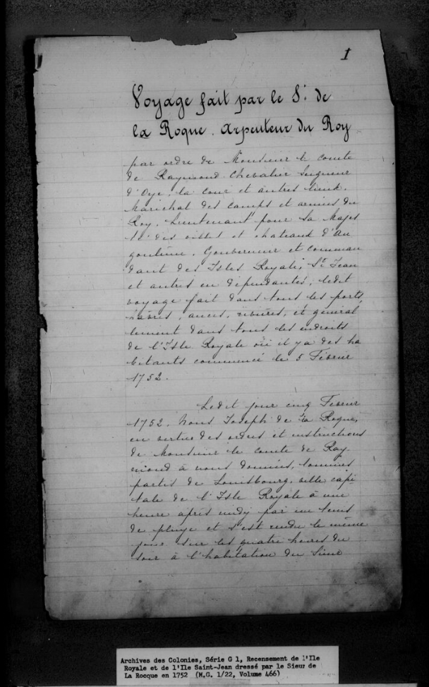 Sieur de la Roque’s 1752 census of Île Royale and Île Saint-Jean – The story of Sieur de la Roque’s voyage around Cape Breton Island in 1752 is as extraordinary as the document that was produced as a result of it. The 1752 census is a critical piece of information for anyone who is researching their family’s Acadian or French roots in Cape Breton or Prince Edward Island before the end of the French regime in 1758. Although limited in scope, the census and the notes made by Sieur de la Roque recreate a kind of snapshot of what was happening around the island in the winter and spring of that year. Below is a PDF version transcribed by Maureen McNeil and available on the acadian-home.org website.