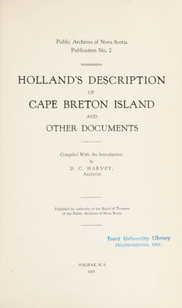 Holland’s Description of Cape Breton Island and Other Documents – Samuel Johannes Holland was an engineer in the British army during the second siege of Louisbourg in 1758. He would go on to become Surveyor General of Quebec and the Northern District of North America. During the 1760s, Holland surveyed Cape Breton Island and preserved his findings in writing. Although identifying suitable locations for future settlement made up the bulk of his work, he made note of what infrastructure still existed from the time of the French. Included with Holland’s descriptions are the 1811 and 1818 censuses of Cape Breton Island.